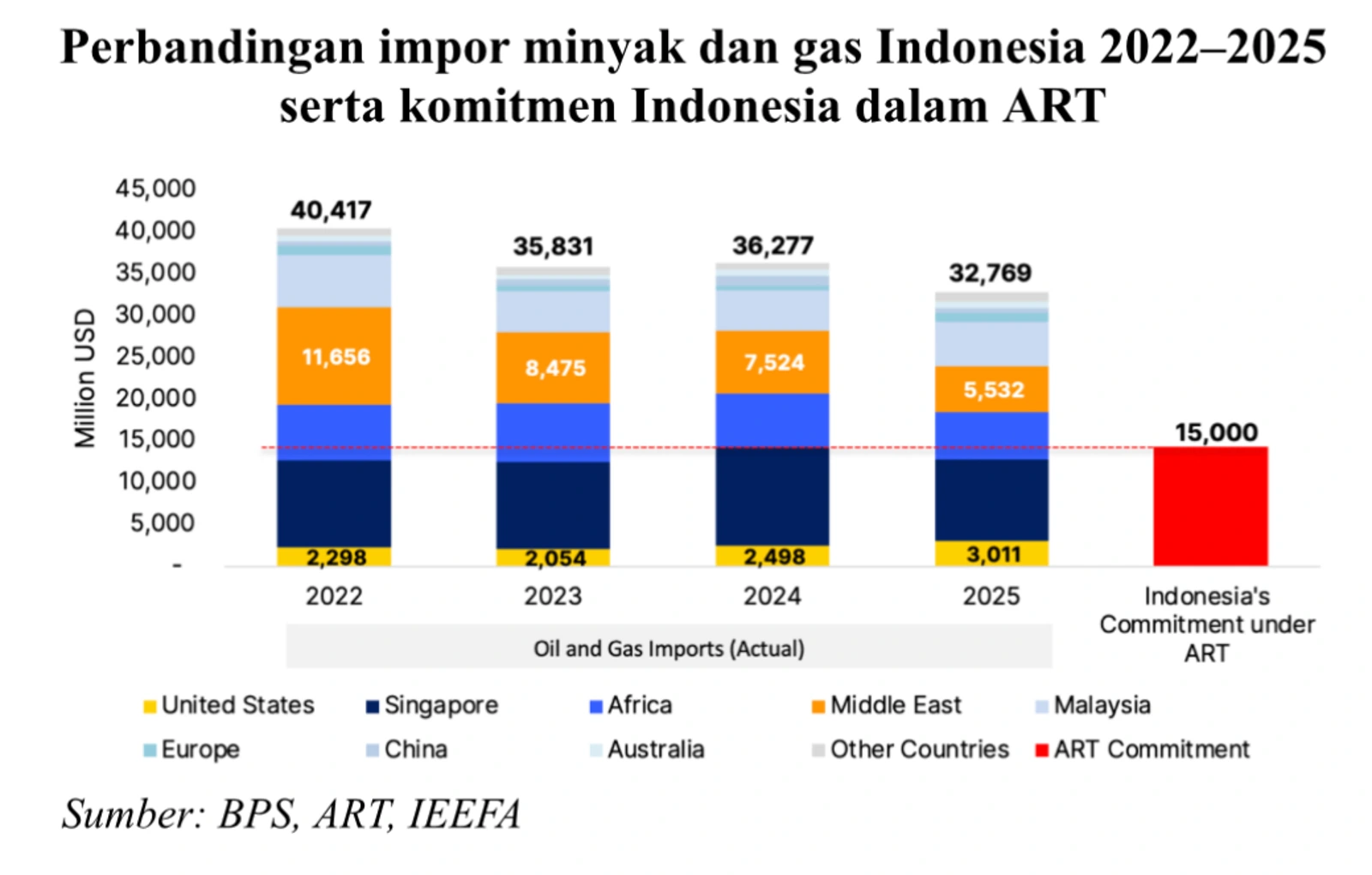 Nilai impor migas Indonesia turun dari USD40,4 miliar atau sekitar Rp683 triliun pada 2022 menjadi USD32,8 miliar atau sekitar Rp554 triliun pada 2025. Namun rencana peningkatan impor dari Amerika Serikat sebesar USD15 miliar per tahun dinilai berisiko menggerus capaian tersebut.