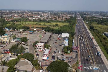 Foto udara kendaraan melintas di KM 57 Tol Jakarta-Cikampek, Karawang, Jawa Barat, Sabtu (14/3/2026). Berdasarkan data Pos Terpadu Operasi Ketupat Lodaya Polda Jawa Barat pada Sabtu (14/3) pukul 12.00 WIB jumlah kendaraan yang melintas di KM 57 pada H-7 Idul Fitri sebanyak 75.000 kendaraan, meningkat 15 persen dibanding periode yang sama pada 2025 sebanyak 66.000 kendaraan. ANTARA FOTO/Fakhri Hermansyah/nym.