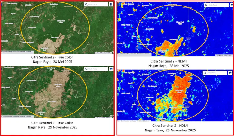 Jadi, satelit tidak hanya menunjukkan peristiwa banjirnya, tapi juga menunjukkan penyebabnya, yaitu tanah dan hutan yang rusak sehingga tidak lagi mampu menyerap air.