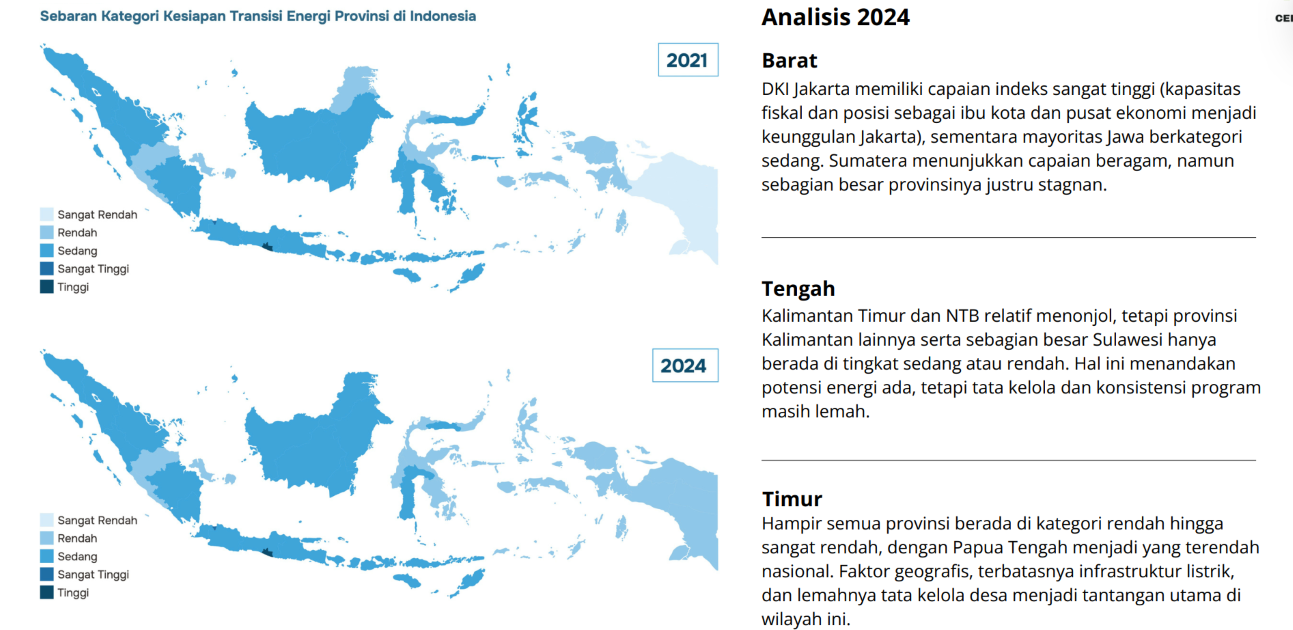 Kaltim dan NTB memiliki inisiatif ekonomi bersih yang cukup baik. Hal itu berkaitan dengan beberapa prioritas program pemerintah dan banyaknya NGO-NGO lokal yang cukup progresif. Sedangkan di wilayah NTT dan daerah-daerah di Papua, transisi energi masih rendah karena faktor geografis, infrastruktur, dan lain-lain.